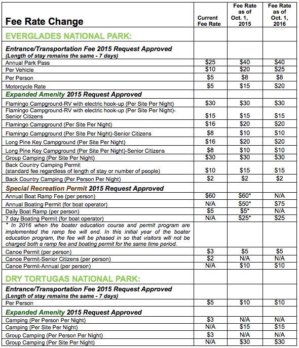 WHAT: Everglades and Dry Tortugas National Parks will increase entrance fees for visitors in order to fund important maintenance and improvement projects within the park. (Please see the attached chart for more details.)